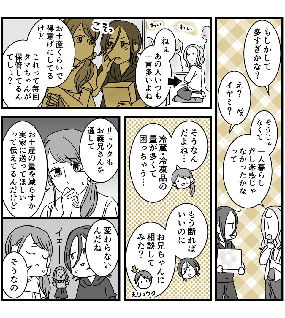 私(タマミ、30代)は3人の子の母。夫(リョウタ、30代)の両親と同じ敷地内に住んでいます。近所に住む義妹(夫の妹、マナ、30代)は一人暮らしで、義兄夫婦はうちから遠い東京に住んでいます。お盆や年末は義実家に親戚一同が揃うのが恒例です。義姉(夫の兄の妻、サヤカ、40代)は毎回大量のお土産を親戚たちに配るのですが、そのお土産は義姉が帰省する数日前にわが家に送りつけられ、保管させられるのです。うちの冷蔵庫に入りきらないほど送られてくるので、私は困っています。