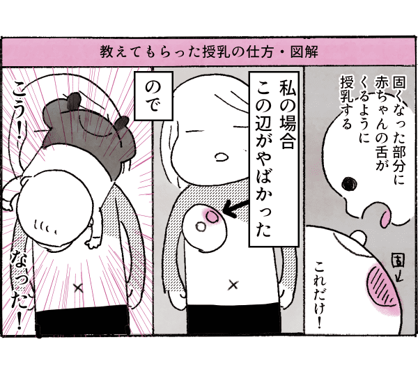 どうやったのか驚いて聞くと、「詰まりの部分(硬くなった箇所)に赤ちゃんの舌が来るような形で授乳すると詰まりが取れやすい」とのこと。