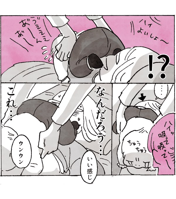 そういうやいなや、横になっていたわたしの顔に覆いかぶさってくる我が子の股間。突然のことに泣いてしまう我が子。わたしも何が起きたのかよく分かりませんでした……。どうやらわたしに対して、子供を逆さまにした状態でそのまま授乳させる模様。泣きながらも、目の前に出されたおっぱいを飲みだす我が子。この状態はなんなんだろう……。