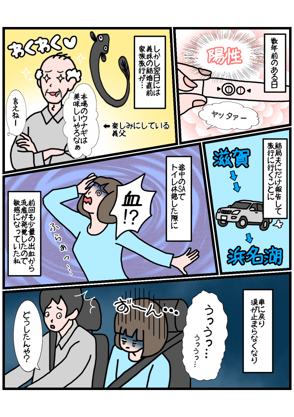 途中のSAで出血して、車に戻った私が号泣していた事から、夫に訳を話しました。そして急いで旅行先の産婦人科へ行くことに。