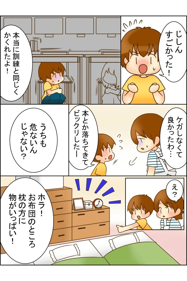 地震を初めて経験した息子6歳、学校にいたので避難訓練が現実のものとなり、いろいろ学んで帰ってきたようです。