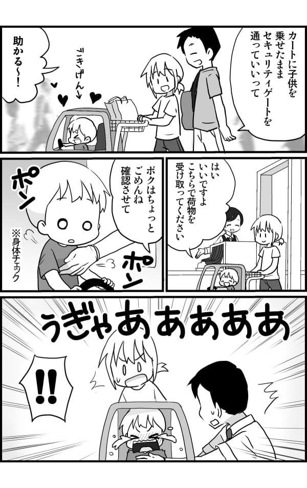 まさかちょっと触られたくらいでこんなに泣くと思いませんでした。泣き止まないので息子をだっこしながらカートを押して搭乗口へ急ぎます。時間があまりなかったので泣いたままおむつを替えて飛行機へ。