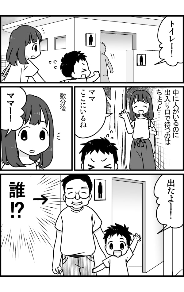 そんなある日、いつもの公園で息子と遊んでいたら「トイレ!」と言うので、男子トイレに連れて行きました。トイレには1~2名の男性がいらっしゃったので、さすがに出入口で待つのは気が引け、少し離れたところで息子を待つことに。