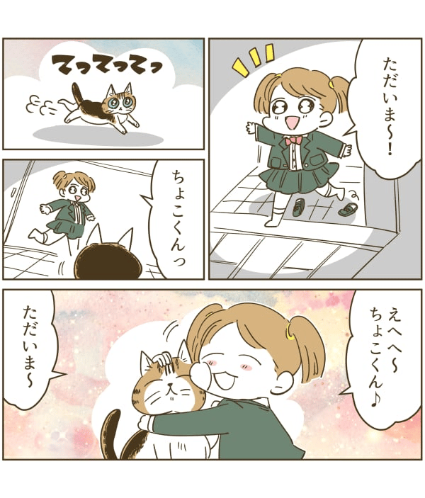 すると、ちょこくんはまるで夫にするように、うっちゃんを出迎えようと小走りで玄関まで迎えに来てくれるのです。「待ってました!」と言わんばかりのちょこくんの熱烈な出迎えに、うっちゃんも「ちょこくん、ただいま~」が日課になりました。