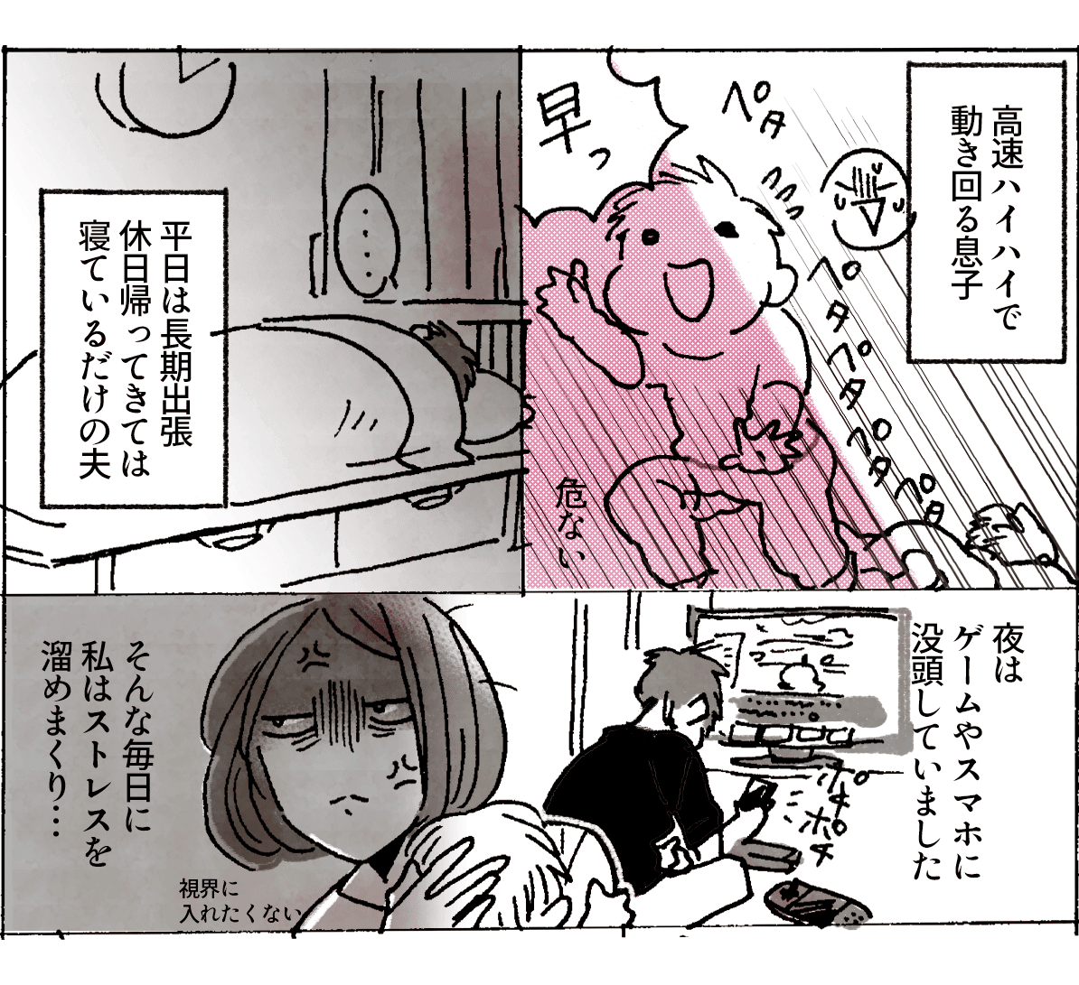 当時夫は、休日夜中にゲームやスマホに没頭し、翌日昼まで寝るという生活でストレスを発散していたようです。で、見ているこっちがストレスを溜める悪循環に。平日は宿泊アリの長期出張で休日の日中は寝ていて夜はゲームの夫と、危険がわからず高速ハイハイで動き回る息子に、神経がすり減るところまですり減った私。