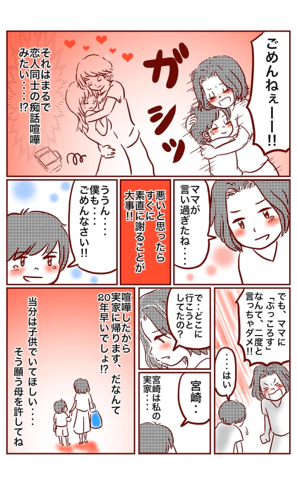 いやいや、「ごめん! 言い過ぎた」と仲直りをして止めなくちゃ……と思いながらもタイミングが掴めない私を置いて、幼稚園バッグを背負った息子は、大きなバッグを引きずりながら玄関へと向かいます。そして涙をぬぐいながら、出て行こうとしているのです……!