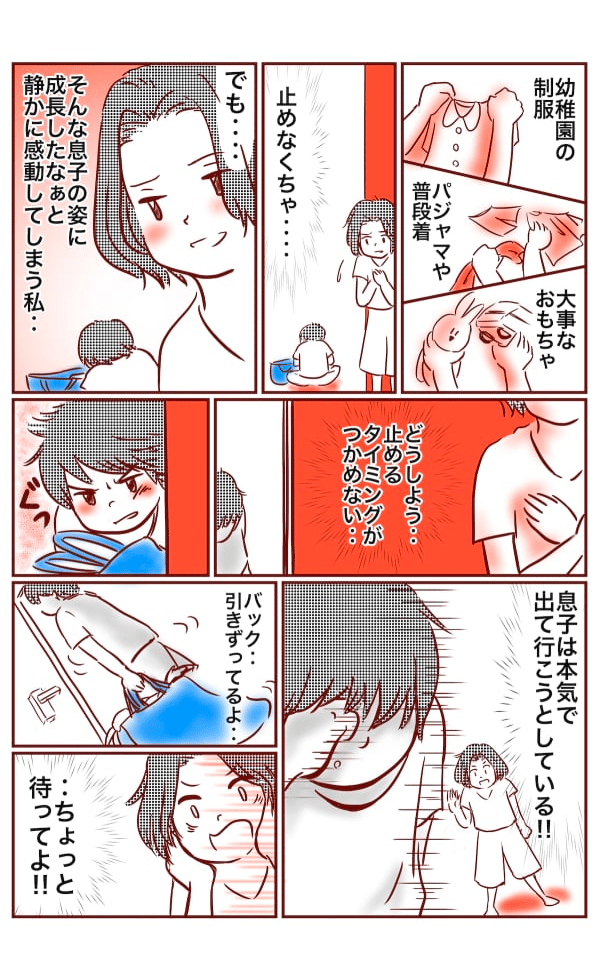 いやいや、「ごめん! 言い過ぎた」と仲直りをして止めなくちゃ……と思いながらもタイミングが掴めない私を置いて、幼稚園バッグを背負った息子は、大きなバッグを引きずりながら玄関へと向かいます。そして涙をぬぐいながら、出て行こうとしているのです……!
