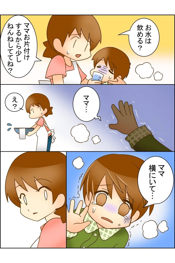 水分だけは何とか取れるものの、横になっていても寝つけず、嘔吐の後の片づけをしている私に「ママ横にいて」と不安そう……。夜は熱にうなされていました。