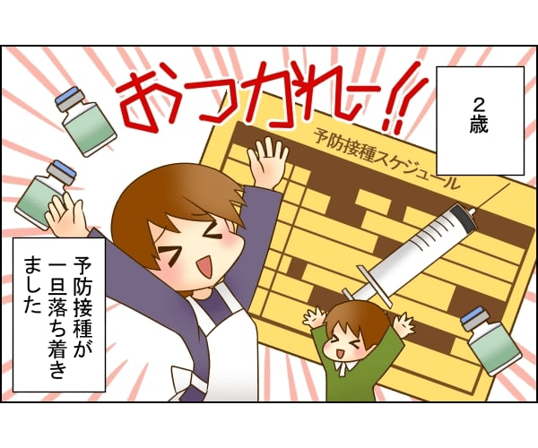 0〜2歳で受ける予防接種、10種類ほどあって大変ですよね。スケジュール調整には一苦労ですが、うまくスケジュールが進むと2歳前半くらいで一旦接種予定のものがなくなります。その後病院に行くのは、体調を崩したときだけになっていくのではないでしょうか。