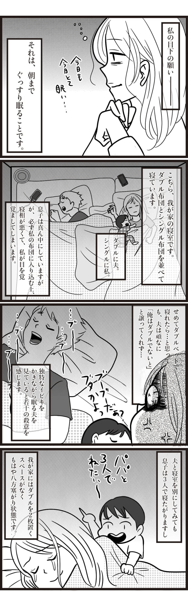 ……にしても、こっちの苦労も知らないでひとりでダブル布団を占領している旦那……。息子がひとりで寝るようになっても、私がそのダブル布団の横にいくことはないだろうと確信した出来事でもありました。