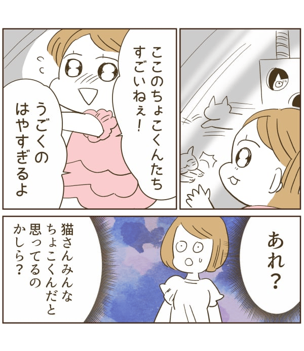 あんなに飽きずに子猫や子犬を見ていたうっちゃんでしたが、「うっちゃんも一人、ママもパパも一人。代わりになる人はいないように、ちょこくんと同じ猫さんはいないんだよ」「ここにいる子猫さんはちょこくんじゃないよ。おうちにいるのがちょこくんだよ」と話したら……