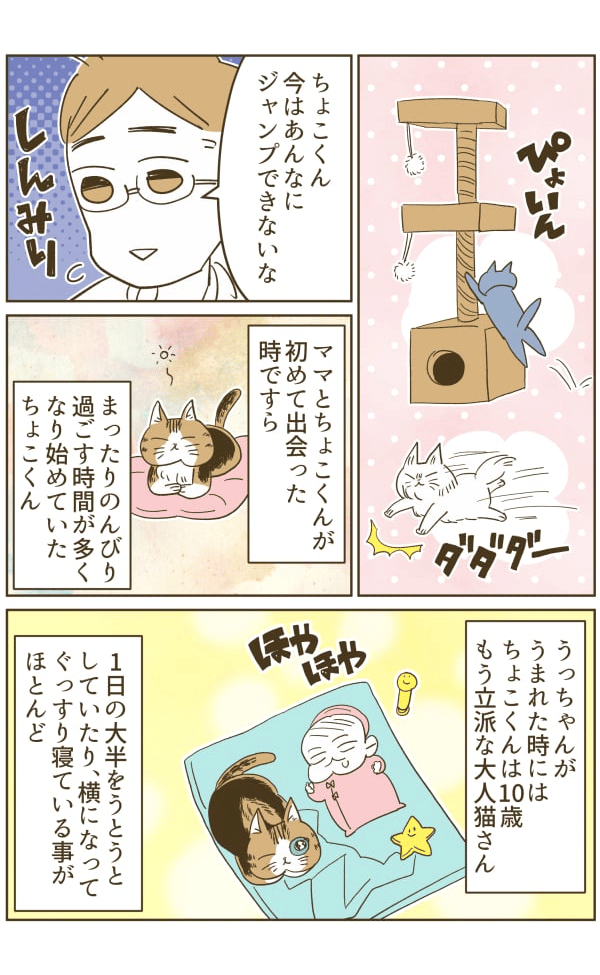 子猫がすばしっこく動く様子や子犬同士がじゃれあって戯れる姿、キャットタワーで遊ぶ子猫たちの驚くべきジャンプ力を目の当たりにしながら、パパとママは「ちょこくん、今はあんなにジャンプできないよね」と少し寂しい気持ちになっていました。