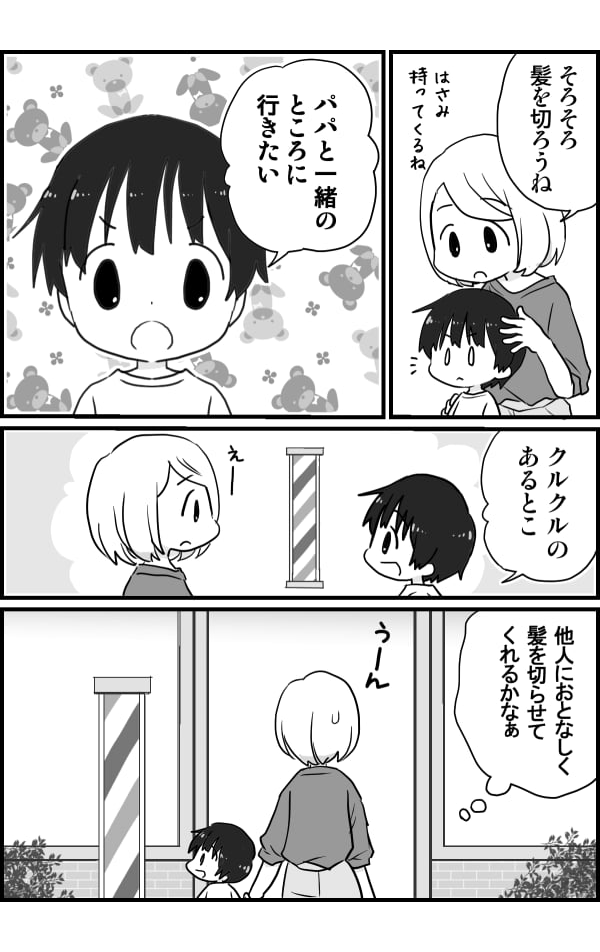 髪が伸び始めてきた4歳の息子。今までは私がカットしていたのですが、あまりにガタガタな出来栄えを不服としたのか、「パパと一緒のところに行きたい!」と言い出しました。