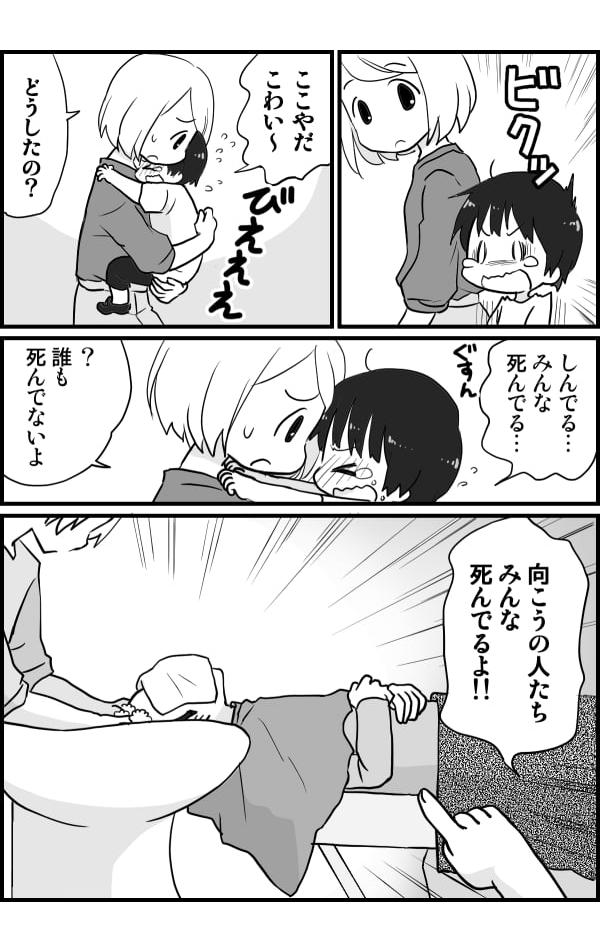 数カ月前に亡くなった祖母の葬儀の際に、亡くなった人は顔に白い布を掛けると記憶していた息子は、理髪店のシャンプー中の人たちも亡くなったと勘違い。