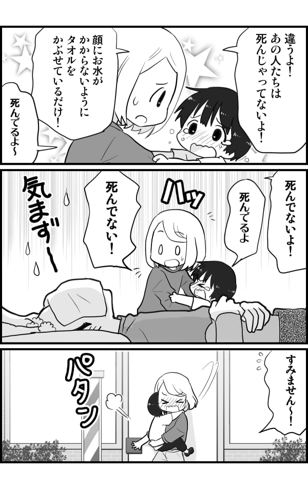 シャンプー中の人たちは、私たち親子の会話「死んでる!」「死んでない!」を聞いて、どう思っていたのでしょうか……。子どもの言ったこととはいえ、本当に申し訳ないことをしました。結局、あまりの気まずさにその日は帰宅。