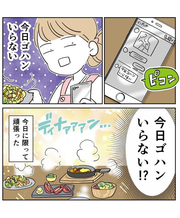 主婦あるあるの上位にランクインしてもおかしくないであろうネタ……そう旦那からの突然の「今日、ご飯いらない」連絡@夕飯の準備が終わった頃。