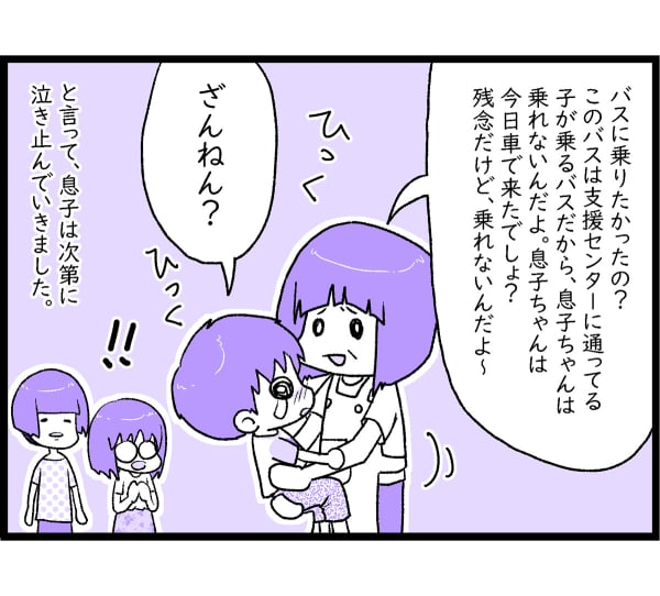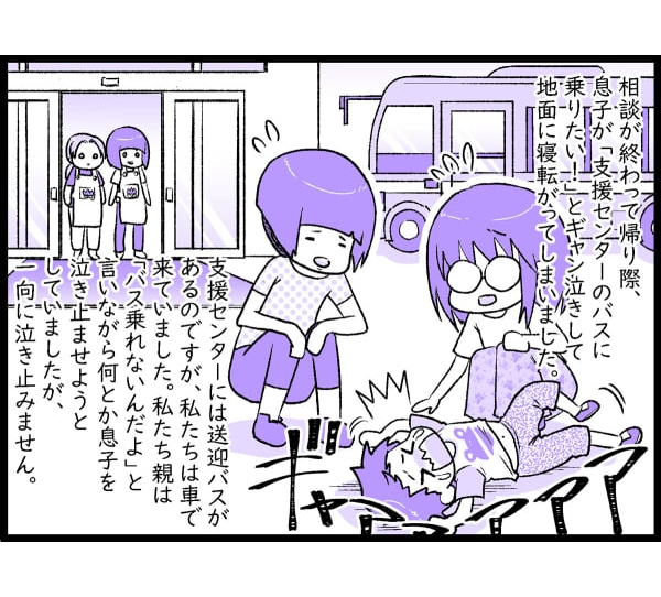 するとさっきの保健師さんがやってきました。寝転がる息子を抱き上げ、「どうしたの? 何がしたいの?」と何度か聞いていました。