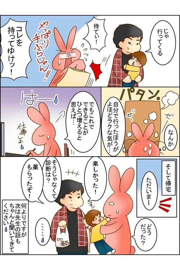 帰宅して様子を聞くと、どうやら無事に受診は済んだよう。待合室でのあそびや、息子が名前を呼ばれただけで泣きそうになったり上手に吸入をしていたりする様子、スタッフさんとの関わりなど、パパは自宅では見られない息子の姿が新鮮だったようで、意外にも「楽しかった」という感想が聞けました。