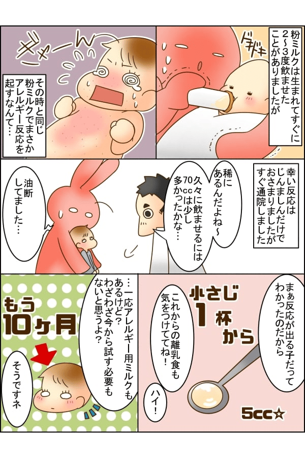産院で飲んでいたミルクだったこと、また離乳食が進む中で食材では一度もアレルギー反応は出てなかったこともあり、どこかで油断していたところもあったかもしれません。