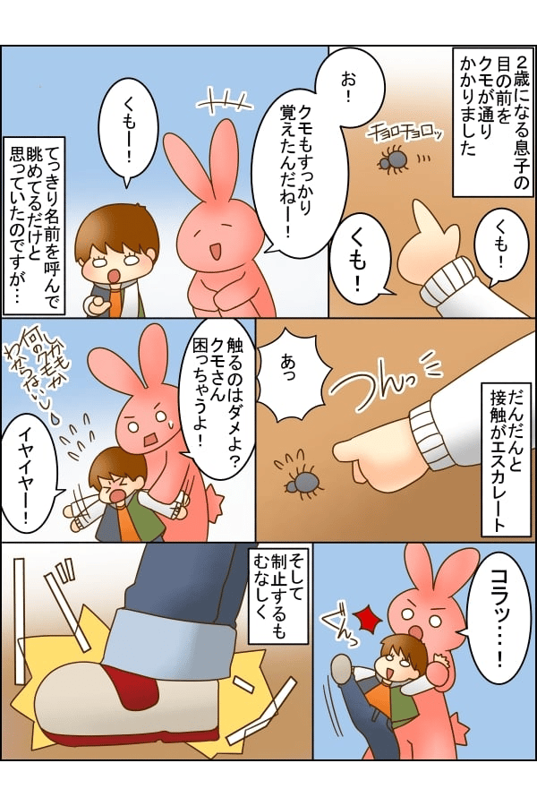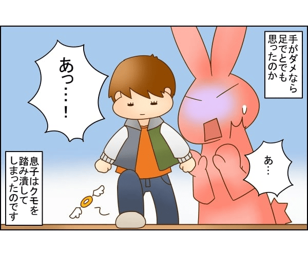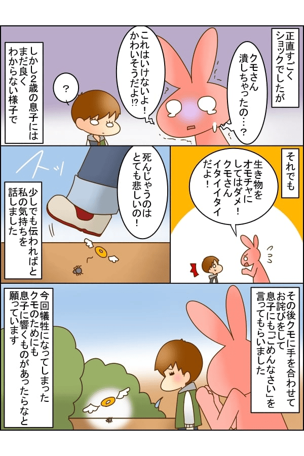 息子に足を避けさせて、潰れてしまったクモを見てもらいながらまず、私が手を合わせお詫びをして、それから息子にも「ごめんなさい」を言ってもらいました。