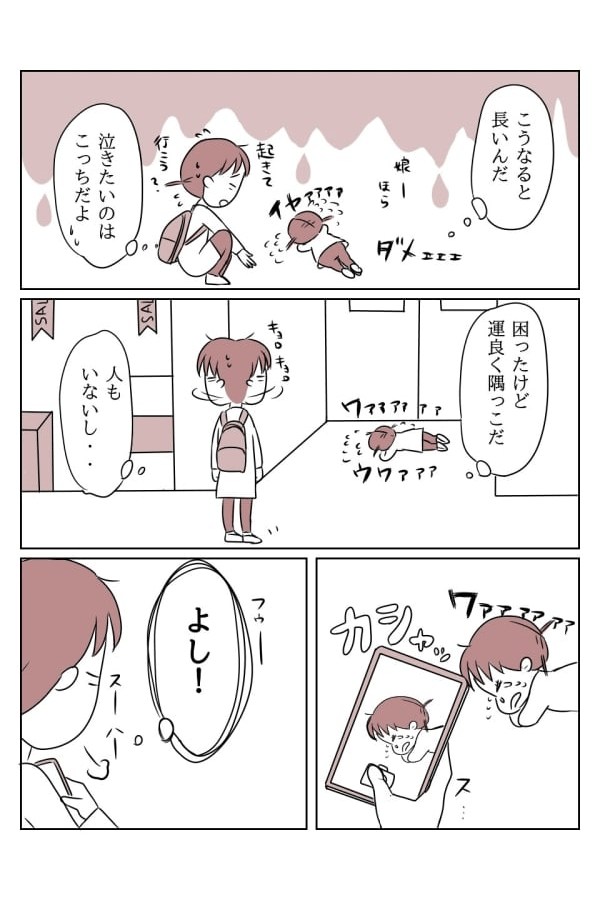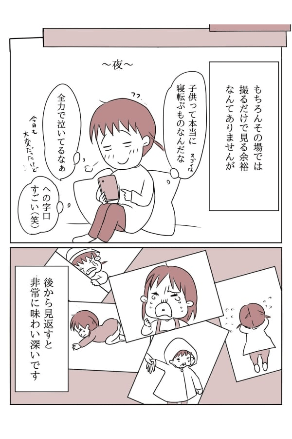写真を撮ったからといって何の解決にもならないのですが、夜娘が寝てから見返した時、写真の娘の泣き顔がものすごく可愛く見えます。渦中にいる時は困ったやら腹立たしいやら、泣き顔だって憎らしく見えてしまいます。しかし写真で見ると顔を真っ赤にして、口はへの字に歪み、体全部で感情を表現している姿はとても幼児らしく愛おしいのです。