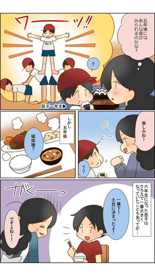 息子が小学校に入学してはじめての運動会で、六年生の組体操に何よりも感動してしまった私。