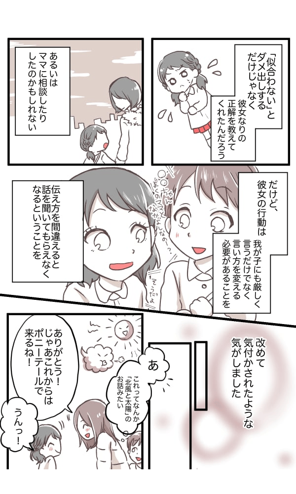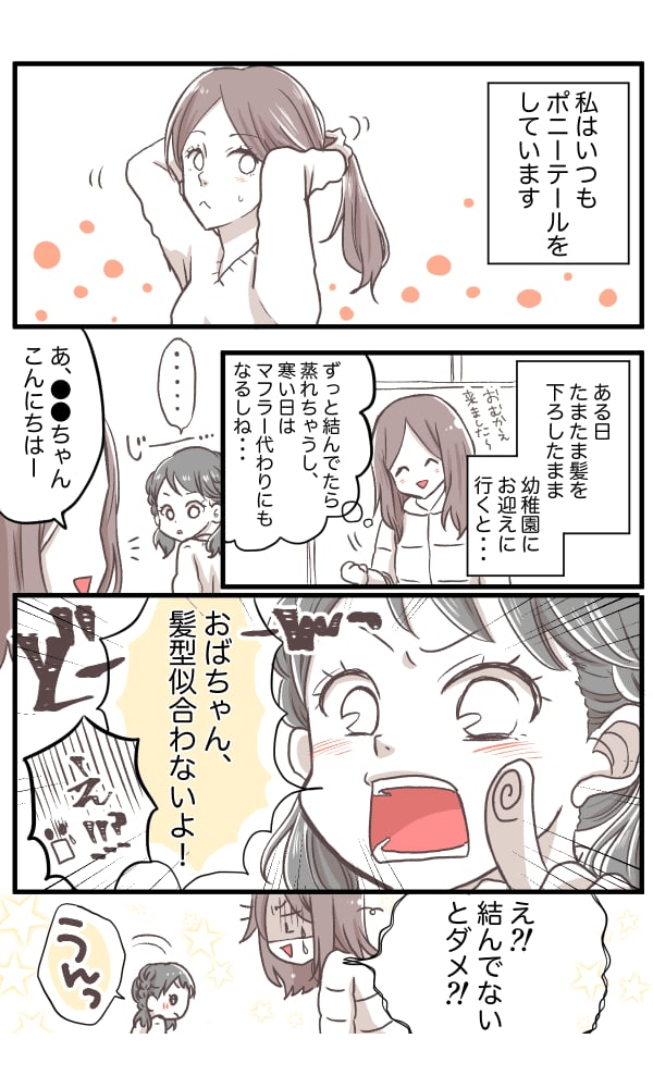 彼女とのやり取り以来、私はひそかに彼女のことを「おしゃれ先生」と呼んで尊敬しています。平日は忘れずサボらず、髪をポニーテールに結ってから送り迎えをすることにしました。