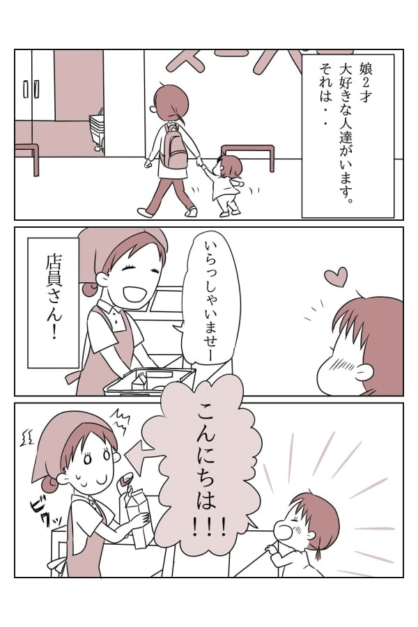 そして娘が挨拶しているのに私がしないのも変かなと思い、いつの間にか一緒にこんにちはと言うようになりました。私自身は元々人見知り。なので知り合いならともかく、店員さんに自分から挨拶などはできなかったのですがすっかり普通になってしまいました。こうして出来上がった、妙に愛想のいい親子……