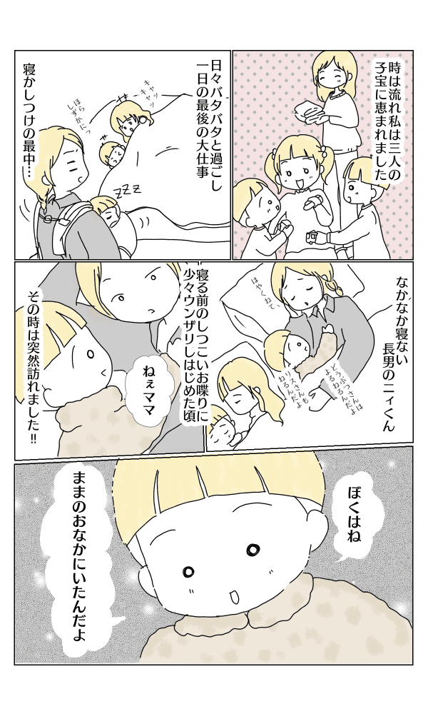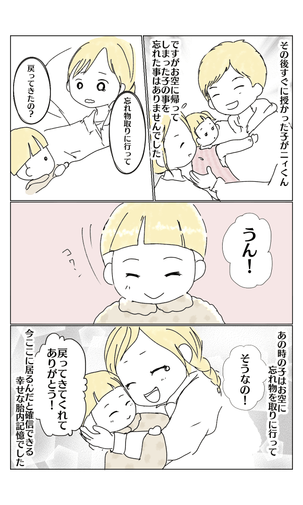 ほんの一言だけの記憶を話し、それ以上は何も言いませんでした。ですが私にとっては、心から信じたい不思議な「胎内記憶」でした。