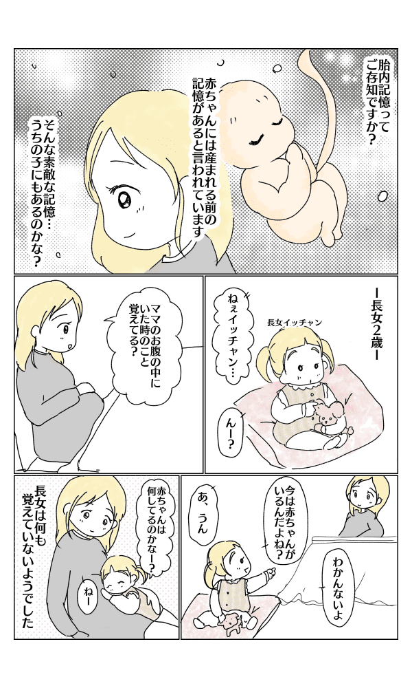 胎内記憶というものがあるらしいと知ってから、いつか我が子から聞いてみたいと思ってました。ですが長女はそれらしきお話はしませんでした。