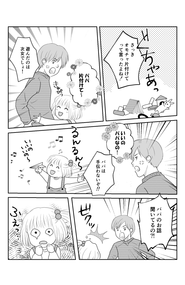 一方、休日くらいしか次女と接点のないパパは、真正面から次女に体当たり。