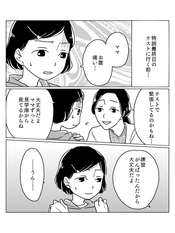テストが始まると娘はガラス越しにチラチラ私を見ます。「がんばって!」「だいじょうぶ!」と口パクで伝えるも不安げな娘。私も気持ちが張り詰めます。いざ娘の番が来ましたが、笛がなってもスタートができません。