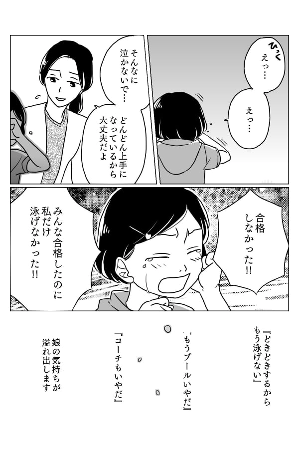 泣きながらプールから出てきました。「大丈夫だよ、頑張った頑張った。また次合格できるよ」と必死になだめるも泣き止まない娘。コーチからのフォローも聞こうとしません。