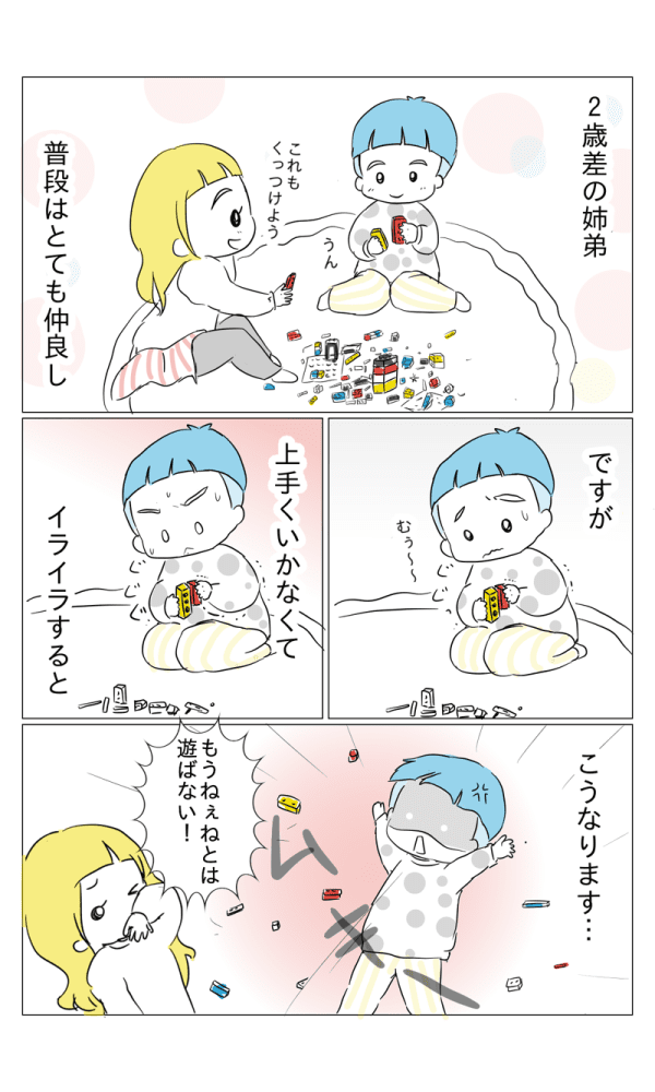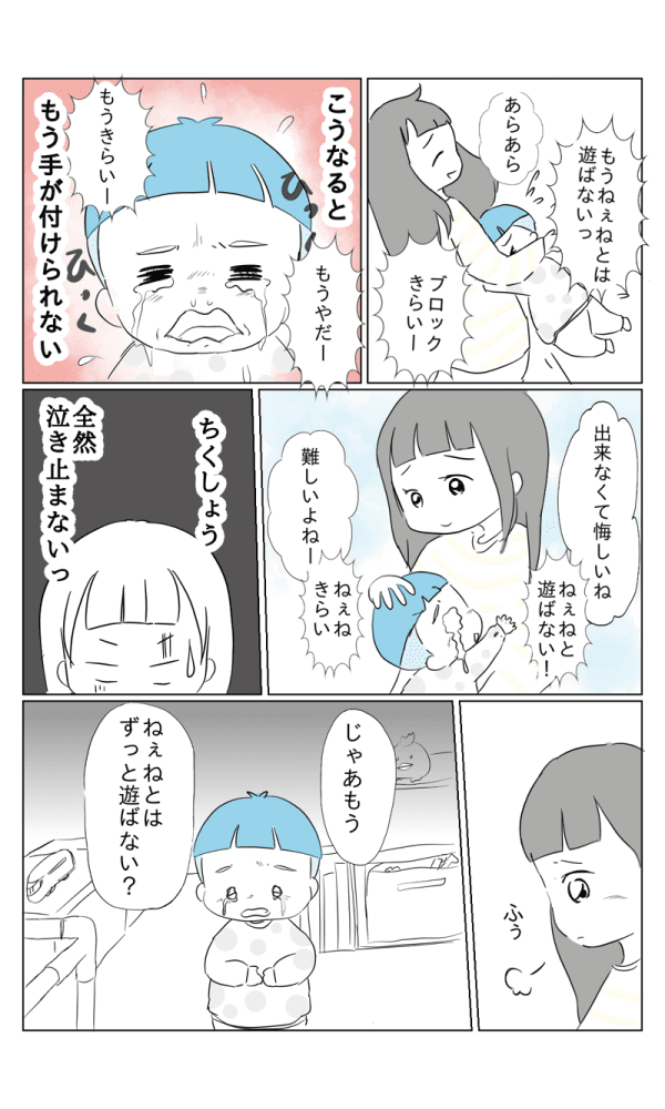 絶賛・癇癪期の長男は、できないことがあると物にあたり人にあたり、すぐに絶望してしまいます。「もうねぇねとは遊ばない!」と泣き出し大騒ぎ。私はしばらく見ていましたが、長男が落ち着く様子がないのでなだめに入りました。