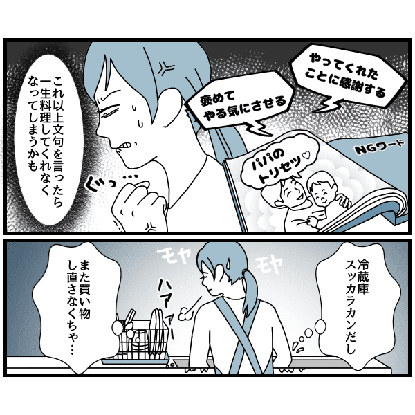 よく雑誌や育児書で目にする「パパは褒めてやる気にさせましょう」「やってくれたことには感謝の意を伝えましょう」という文言。そんな文言を目にする度に、思わず目が据わってしまう私。