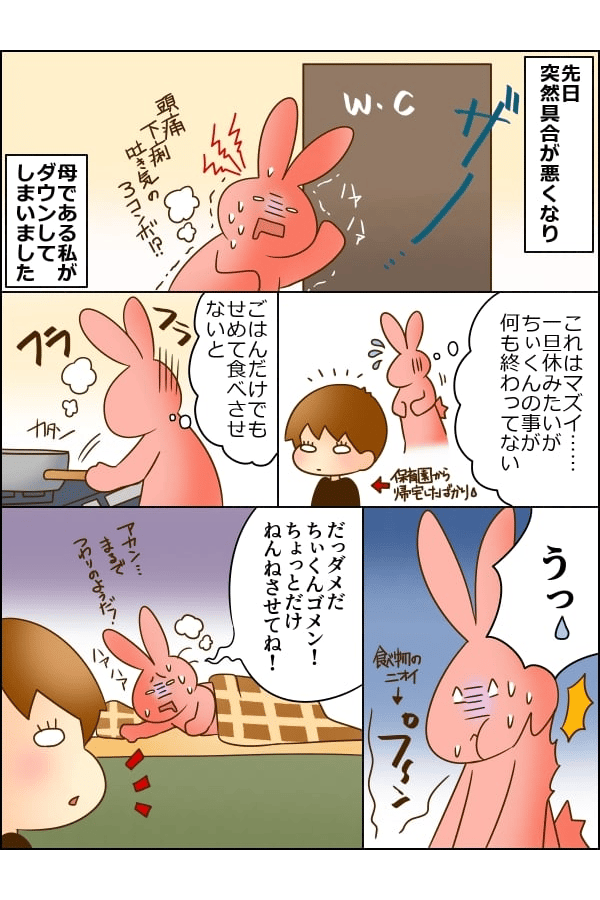 これはマズイ! とにかく一旦休まないとダメだとハッキリわかったのですが、その時はちょうど保育園から帰ってきたばかりの息子・ちぃくん(2歳)がいました。