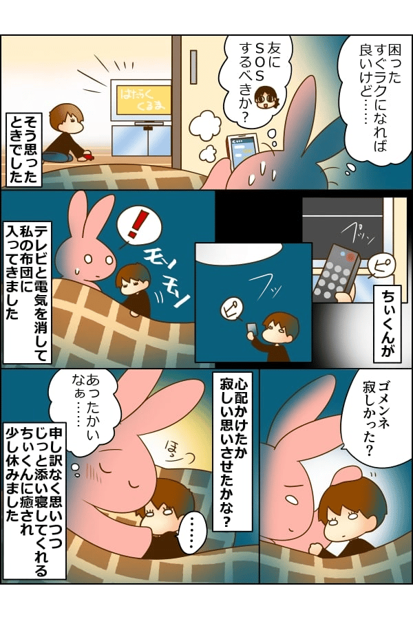 まだ夕食もお風呂もお着替えもなにもできておらず、けれども私の体は動かず……。どうしようかと困り果て、友人の助けを呼ぼうかと思った矢先のことでした。