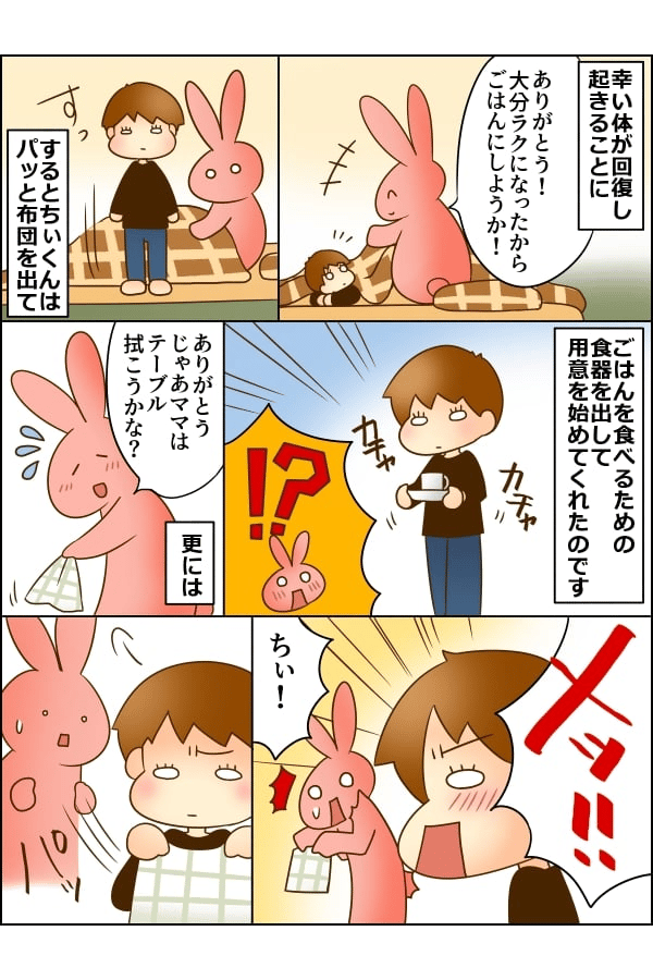 その後もちぃくんは食器の片付けの日課はもちろん、いつもなら言いたい放題なイヤイヤもなく、寝るまでずっとすごく気をつかってくれました。