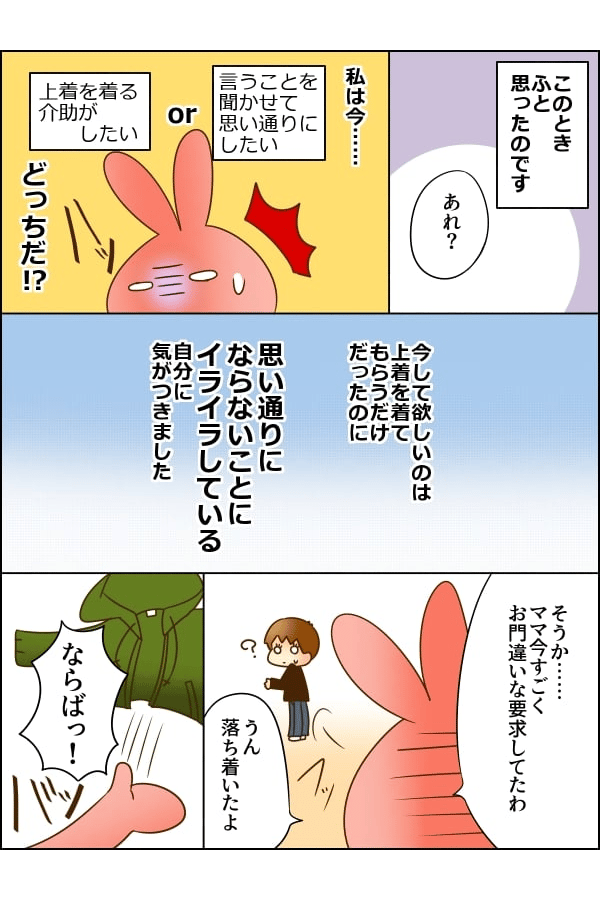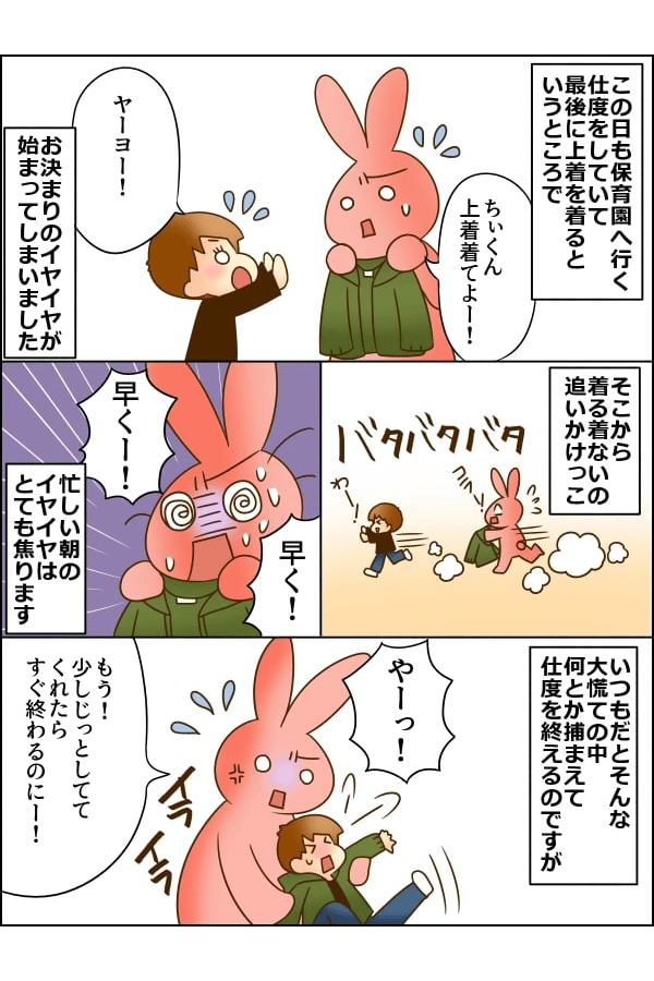 結果的に、イヤイヤに付き合った時間と、追いかけっこに付き合ってから上着を着せた時間は、それほど変わりませんでした。しかも私自身、イライラすることなく支度できました。