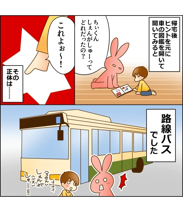「しぇんがしゅー」の正体は「路線バス」でした。ちぃくんの中では、バスも単なる「バス」ではなく、「路線バス」や「ようちえんバス」というように区別されて始めているようでした。質問にも答えてくれるようになっています。謎が解けて私はスッキリ、ちぃくんも正しい発音が聞けて満足した様子。