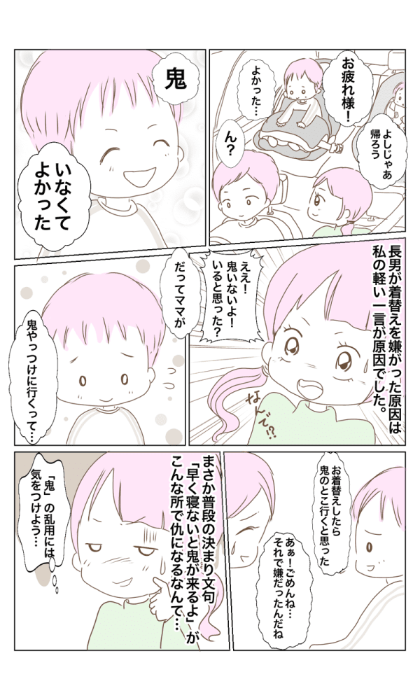 長男は「これを着たら、鬼と戦わなくちゃいけない!」と解釈し、全力で着替えを拒否してたようです……。普段から、どれだけ「〇〇しないと鬼が来るよ」を使っていたのか、身に染みて反省……。