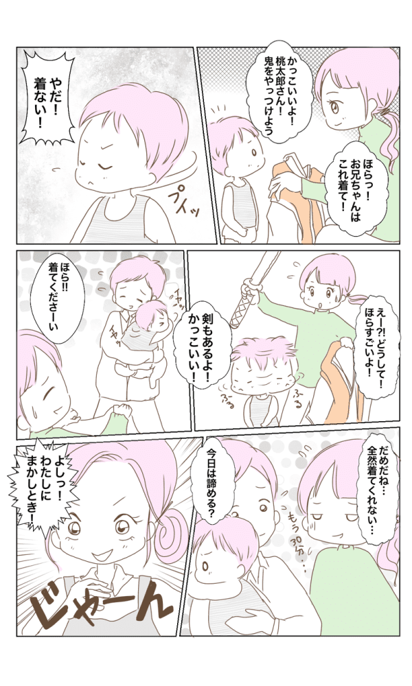 なんと着替えを渋った原因は、私が軽い気持ちで言った言葉……「桃太郎になって鬼をやっつけに行こう!」の一言でした。