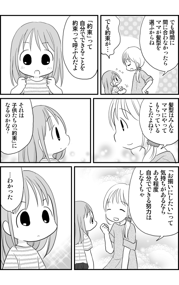 そして、「決められた時間までに支度を終えられたら好きな髪形にしてあげる!」と約束し、朝のバタバタはなくなりました。出かけるまでに20分あるので、さすがの私もゆったり髪のセットに挑むことができます(笑)。