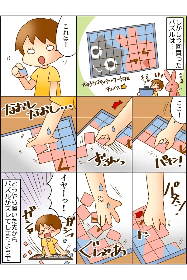確かにこれではいつまで経っても完成できず、イライラします。ちぃくんには、元の凸凹が多くついたピースのパズルを渡して遊びなおしてもらいました。