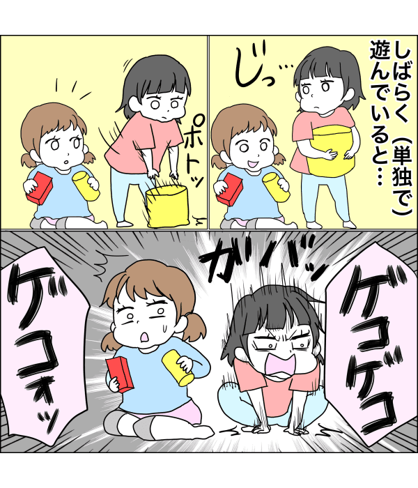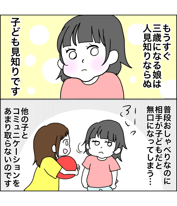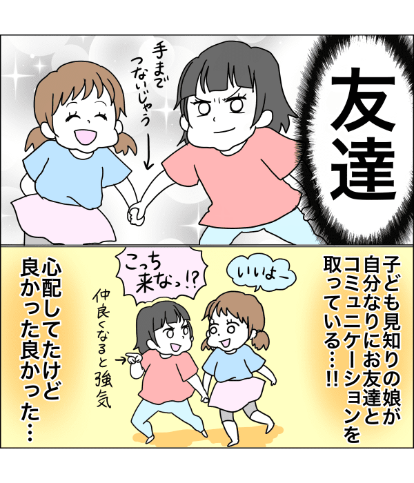 とってもツッコミたいのですが、とりあえず娘なりにコミュニケーションを取ろうと模索している姿にちょっと安心しました。いつか「一緒に遊ぼう!」と普通に言えると良いね!