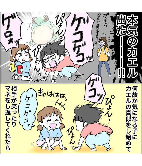「ケロケロ」と鳴く可愛いカエルではなく、リアルなカエルの方のマネが始まるのです!(笑)