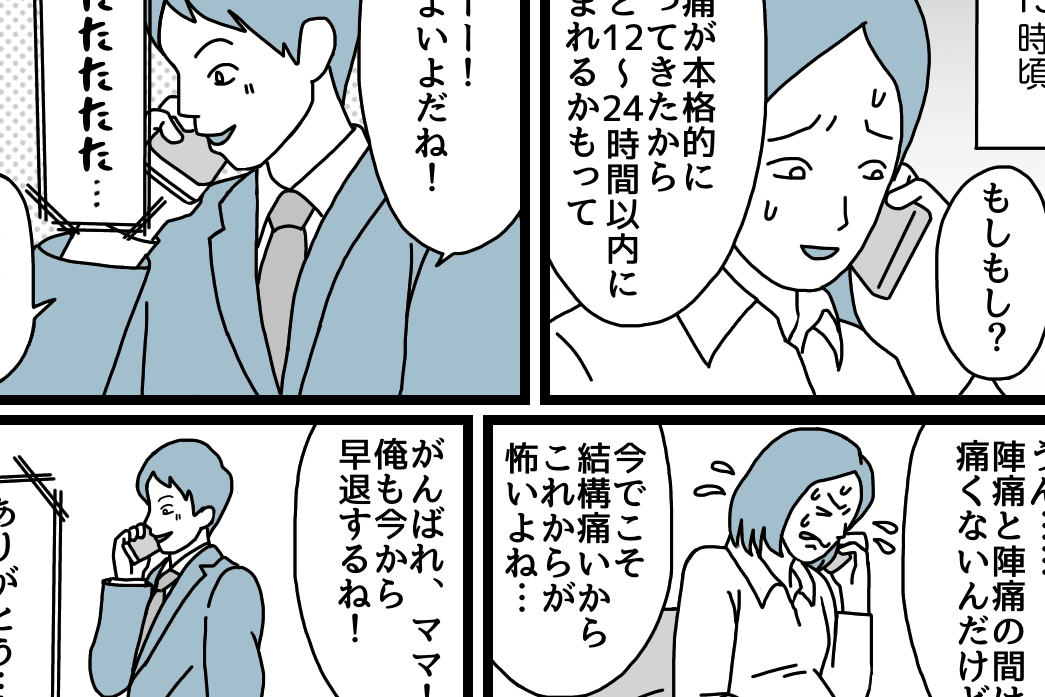 その日、朝起きたときから何となくお腹が痛かった私。その日は健診日だったということもあり「病院行ってまた連絡するね」と言っていつものように旦那の出勤を見送りました。それからどんどん強くなってくる痛みに耐えながら、急いで病院へ。本陣痛がはじまっているとのことでしたが、「あと12時間~24時間くらいはかかるかな~? 念のため入院しましょうか」と先生に言われ、慌てて陣痛の合間をみて旦那に電話しました。