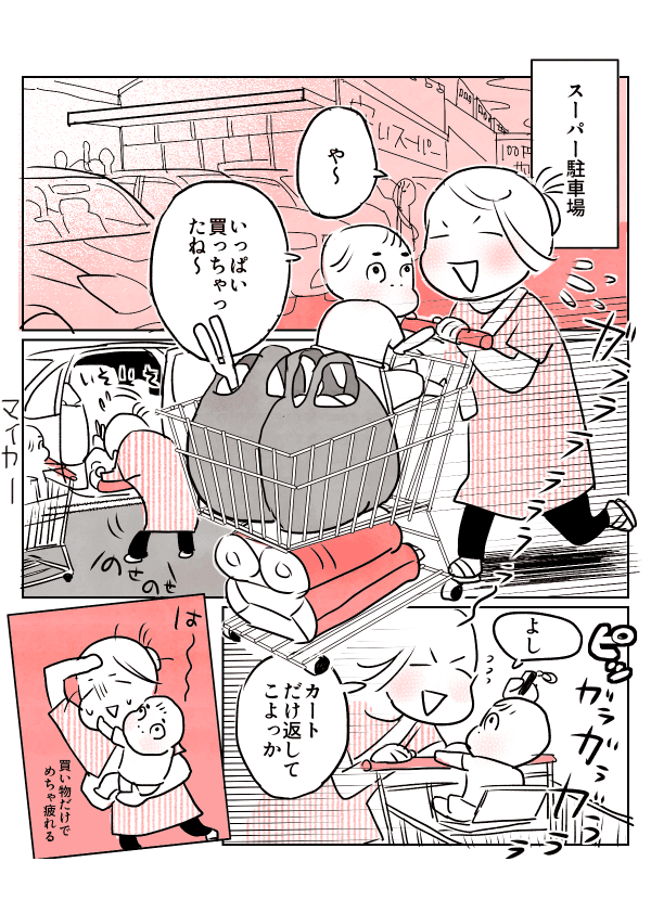 車でスーパーに買い物に行った帰りのことです。荷物が多かったので、ショッピングカートに子どもと荷物を載せたまま、カートを車まで引いていきました。