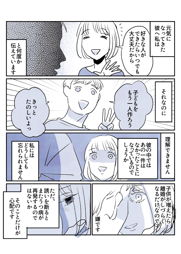 前回からの続き。5年前に職場のパワハラが原因でうつ病になった旦那。私は妻として、言葉で表し尽くせないほど献身的にサポートしてきました。地獄のような2年間を乗り越えて3年目の春。旦那はだんだんと病状がよくなってきて、「人生をもう一度やり直したい」とたびたび口に出すようになりました。いい傾向だと思っていたのですが……。あるとき、いつもの会話の中で、彼は言ってしまったのです。「