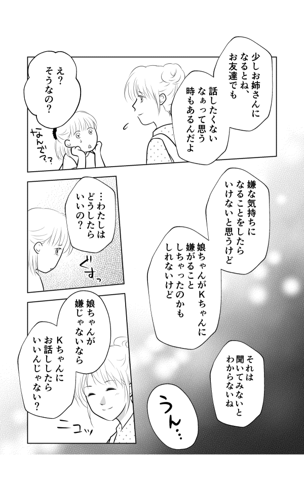 娘にどんな話をしたのか聞いたところ、Kちゃんは「違うクラスになったよね」と言っていたのだそう。もしかしたら年下の娘が先に進級したのが嫌だったのかな? と想像を巡らせてしまいました。もちろん、私の見えないところで娘がKちゃんの嫌がることをしてしまったのかもしれません。Kちゃんに答えを聞いていないのでわかりませんが、もしかしたら嫉妬が原因だったのかもしれません……。